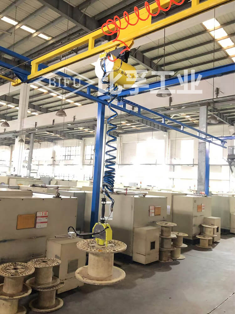 氣動同軸控制款氣動平衡吊配氣動夾具配自立式框架軌道上下料應用案例。